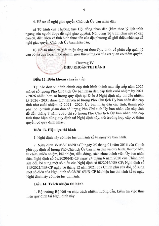 Nghị định số 300/2025/NĐ-CP gồm 4 chương, 14 điều quy định khung số lượng Phó Chủ tịch UBND, số lượng, cơ cấu Ủy viên UBND; trình tự, thủ tục đề nghị phê chuẩn kết quả HĐND bầu, miễn nhiệm, bãi nhiệm Chủ tịch, Phó Chủ tịch UBND; trình tự, thủ tục điều động, cách chức Chủ tịch, Phó Chủ tịch UBND và giao quyền Chủ tịch UBND tỉnh, thành phố, xã, phường, đặc khu