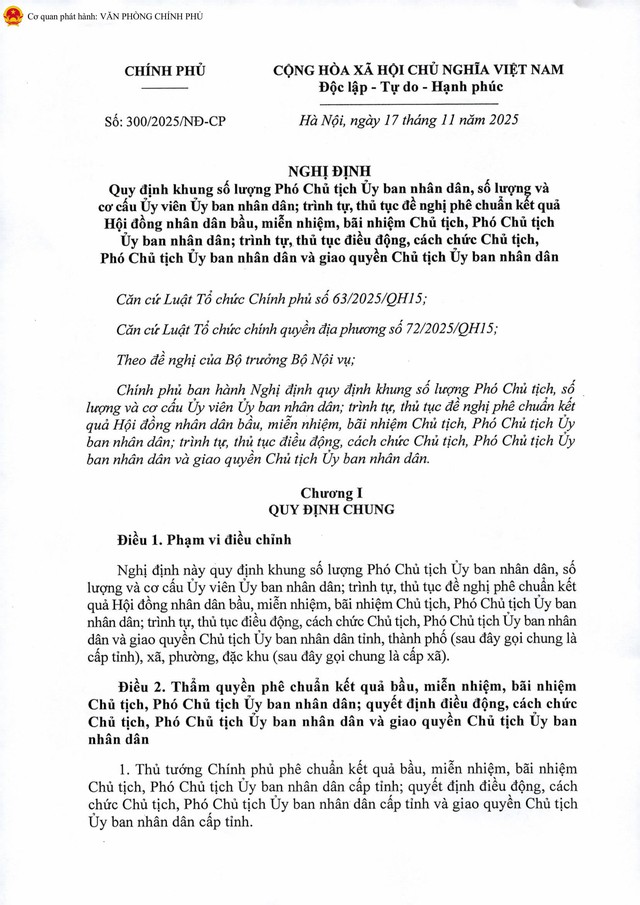 Toàn văn Nghị định số 300/2025/NĐ-CP ngày 17/11/2025 của Chính phủ quy định khung số lượng Phó Chủ tịch UBND, số lượng và cơ cấu Ủy viên UBND; trình tự, thủ tục đề nghị phê chuẩn kết quả HĐND bầu, miễn nhiệm, bãi nhiệm Chủ tịch, Phó Chủ tịch UBND; trình tự, thủ tục điều động, cách chức Chủ tịch, Phó Chủ tịch UBND và giao quyền Chủ tịch UBND.