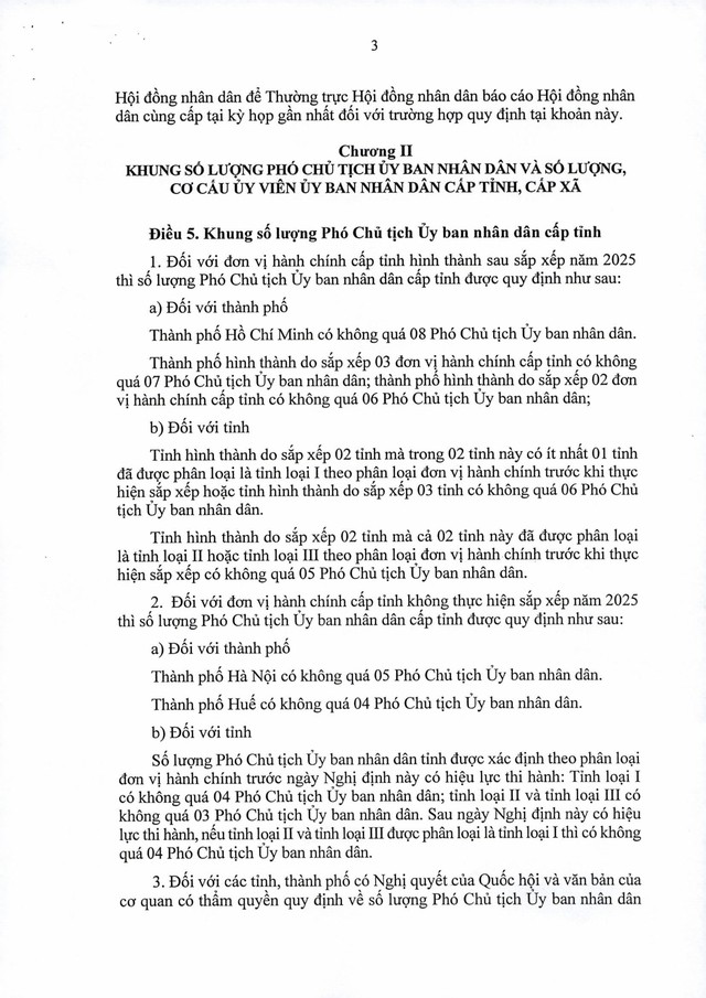Chương II, quy định khung số lượng Phó Chủ tịch UBND và số lượng, cơ cấu Ủy viên UBND cấp tỉnh, cấp xã (từ Điều 5 đến Điều 7).